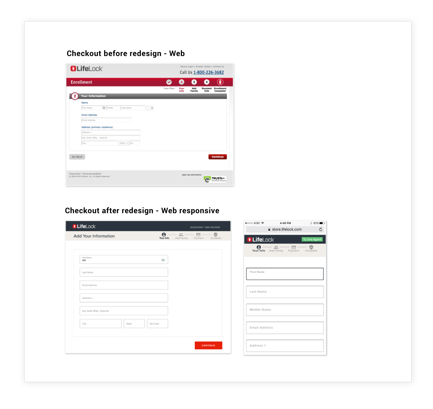 Final designs – Introduced a clear step flow and progressive disclosure to reduce cognitive load. The redesign also reduced the amount of required information to complete the process of checkout. The team also introduced new brand guidelines via the redesign.
