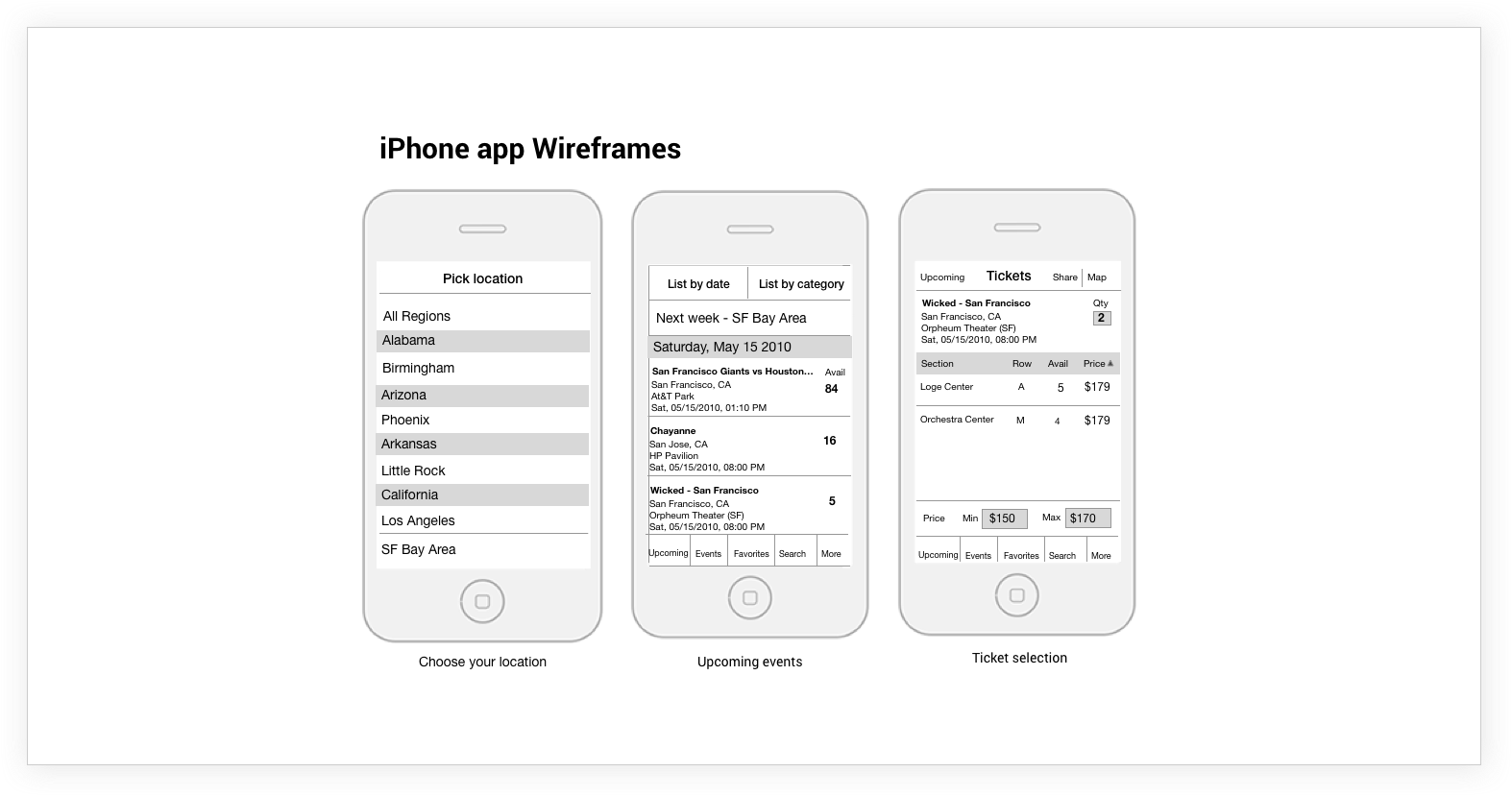Design iterations – A lot of event information had to be communicated on each row of the upcoming events screen. I iterated on a few different information layouts. I iterated the most on the ticket selection and seat map screens as I had to make it very simple and quick for a user to find tickets in their price range.