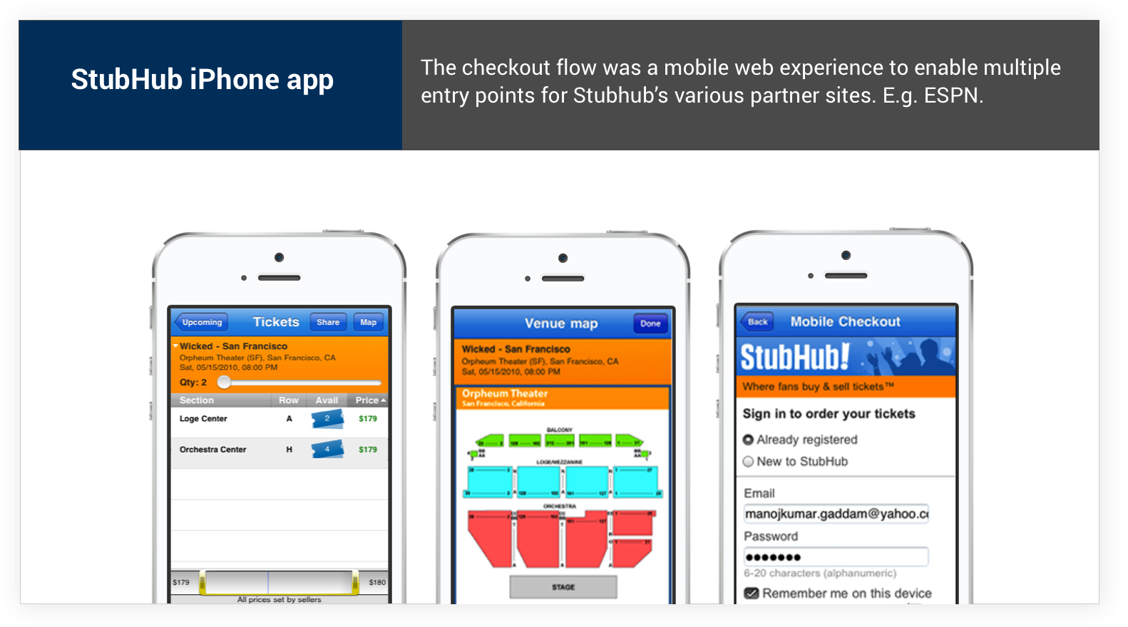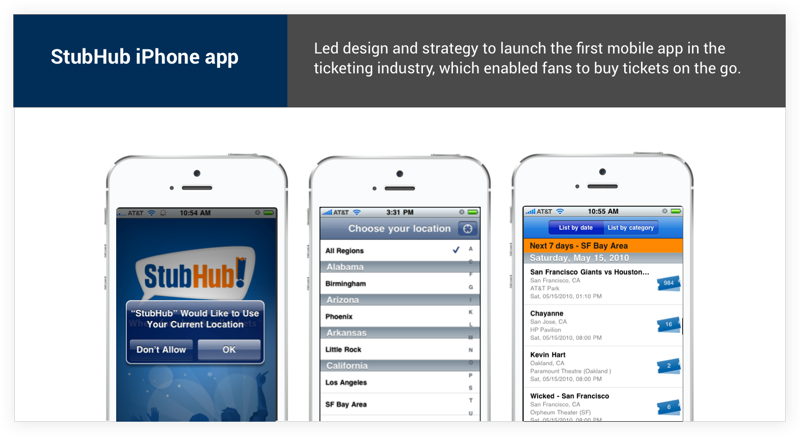 Creating the StubHub mobile web checkout flow was challenging as it had to integrate with the native iPhone app. I worked closely with the engineering team to ensure a seamless experience was designed and executed.